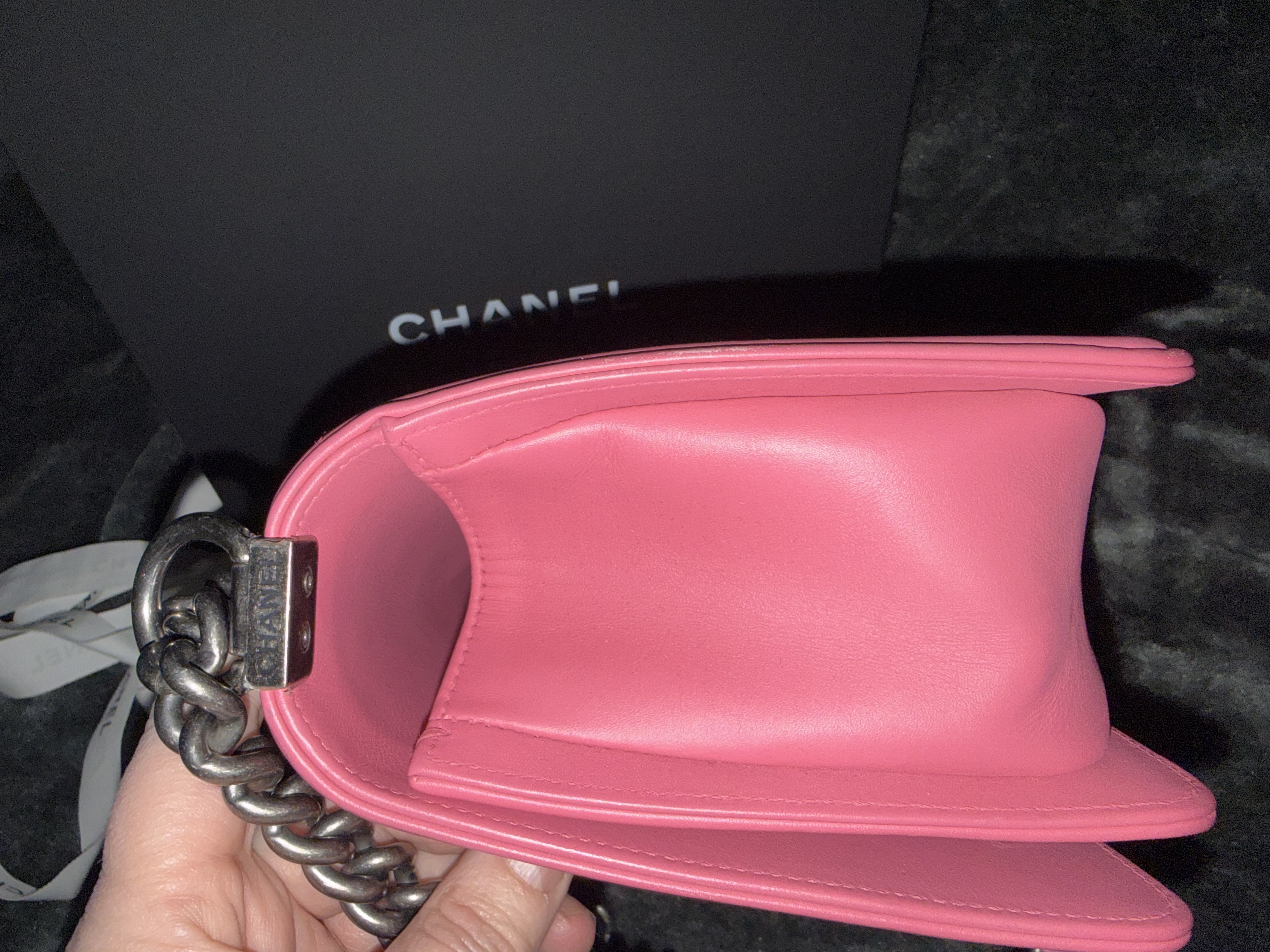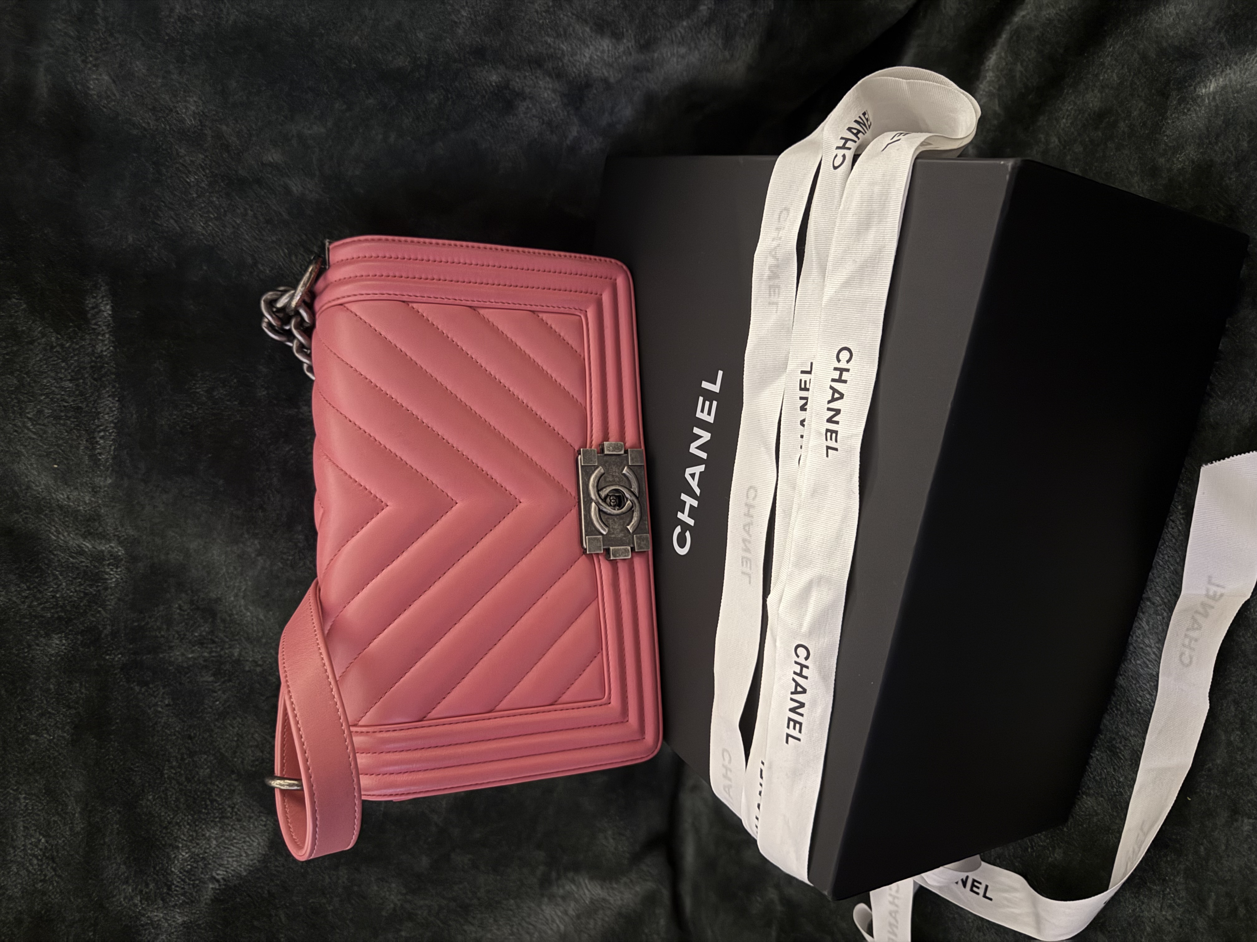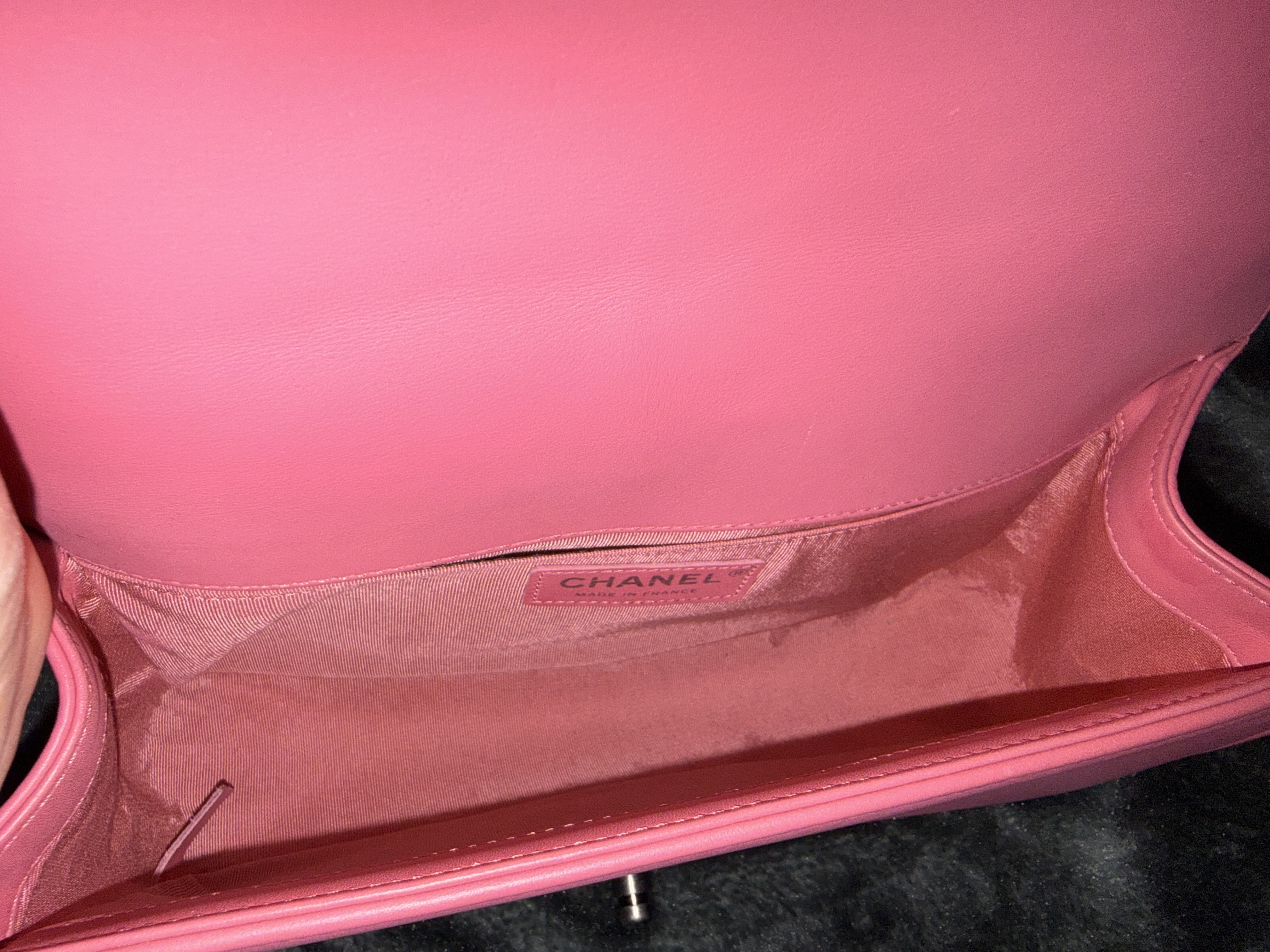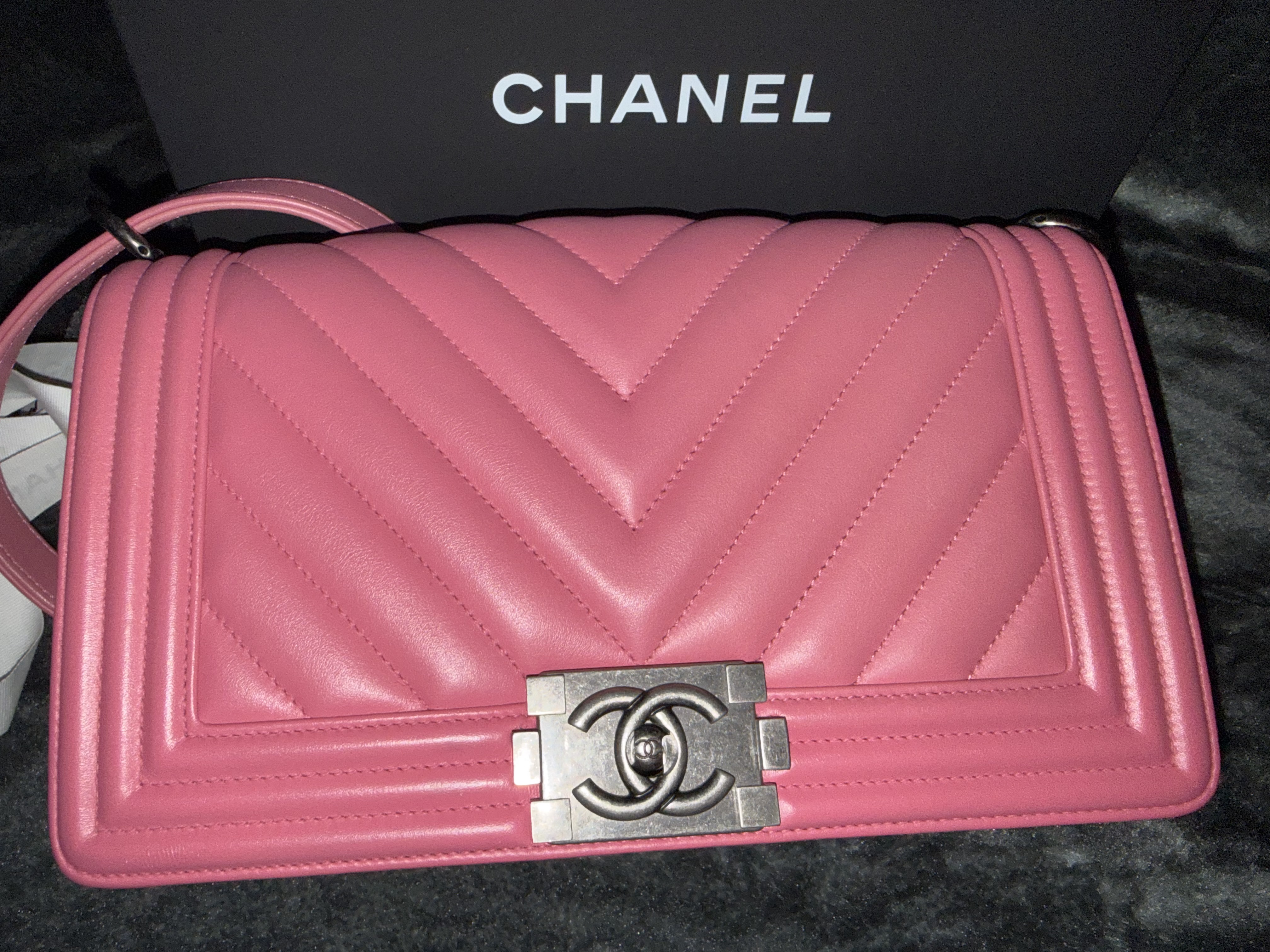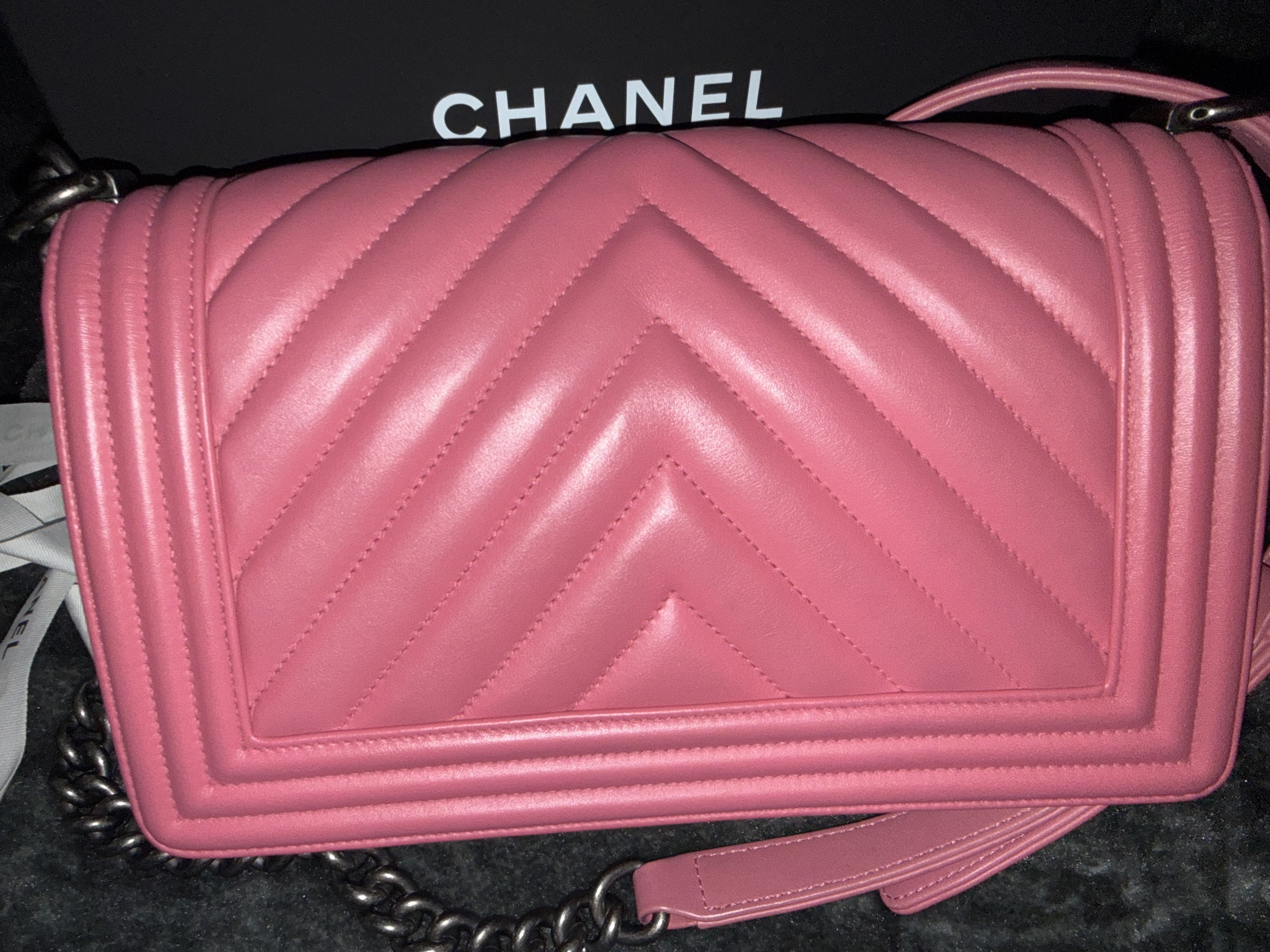 Chanel BOY CHANEL 25 Lambskin Chain Shoulder Bag Chevron Pink Gunmetal Fittings